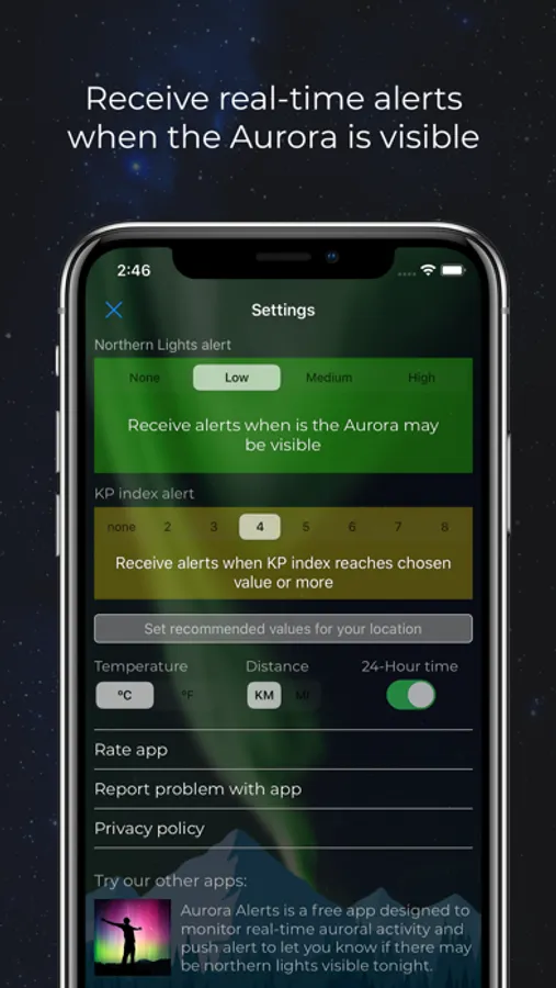 Receive real-time alerts when the aurora is visible at your location or Kp index reaches chosen value. You can customize alert level.