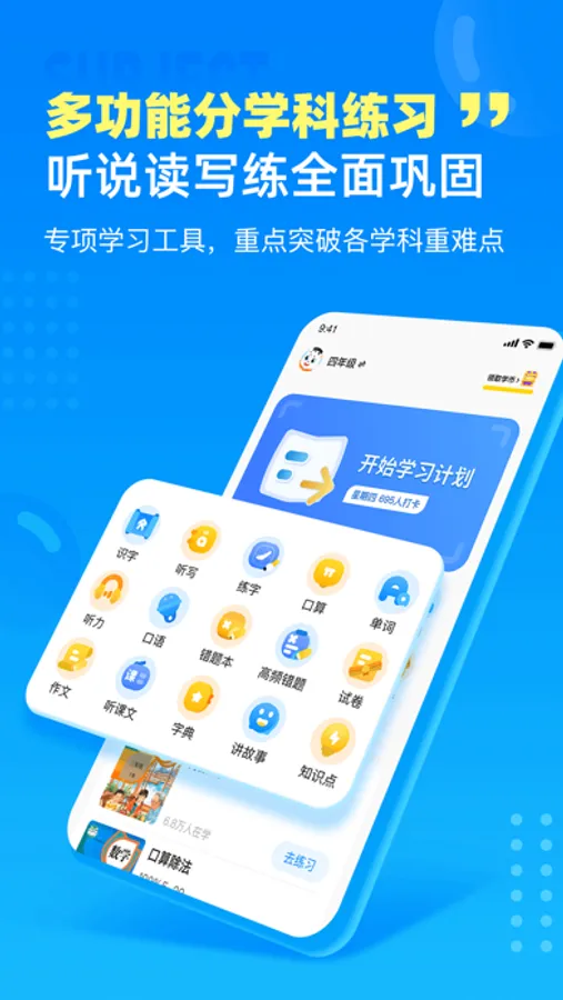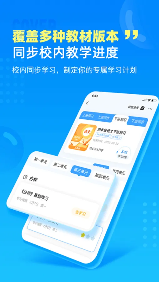 智能教辅覆盖人教版、北京版、苏教版、西师大版、青岛版、冀教版等95%以上教材,100%与教材同步,按照课本单元章节生成学习计划,针对语文数学英语不同学科的特点及内容,配套专项学习工具。