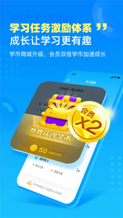完成学习任务就获得学币,多种学具玩具等实体礼品与卡通形象、背景、皮肤装扮免费兑换,帮助学生养成良好学习习惯,让孩子有目标,有动力,爱上学习!