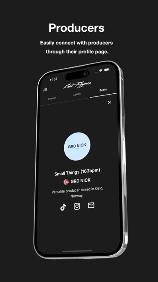 Swipe from the lyrics you are writing to a selection of high-quality beats, which you can conveniently play in the app, loop them and get in the zone. Then easily reach out and connect with producers through the app.