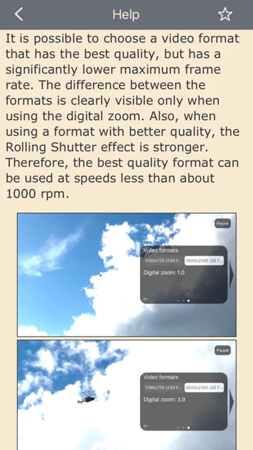It is possible to choose a video format that has the best quality, but has a significantly lower maximum frame rate. The difference between the formats is clearly visible only when using the digital zoom. Also, when using a format with better quality, the Rolling Shutter effect is stronger. Therefore, the best quality format can be used at speeds less than about 1000 rpm.