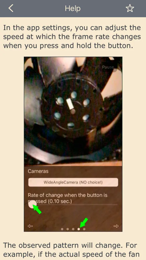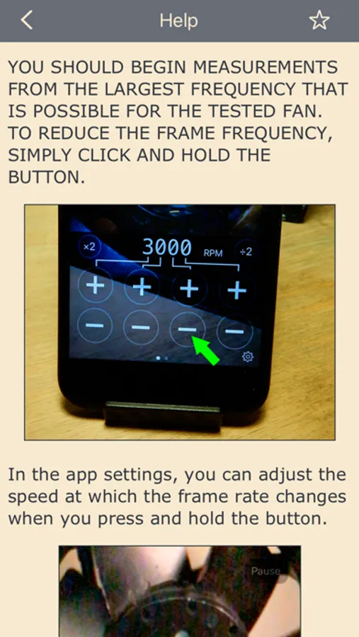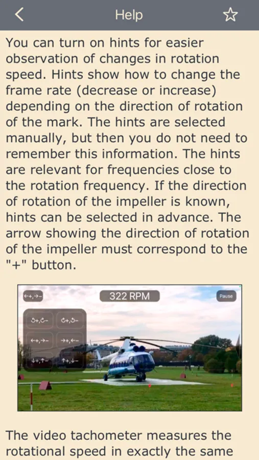 You can turn on hints for easier observation of changes in rotation speed. Hints show how to change the frame rate (decrease or increase) depending on the direction of rotation of the mark. The hints are selected manually, but then you do not need to remember this information. The hints are relevant for frequencies close to the rotation frequency. If the direction of rotation of the impeller is known, hints can be selected in advance. The arrow showing the direction of rotation of the impeller must correspond to the "+" button.