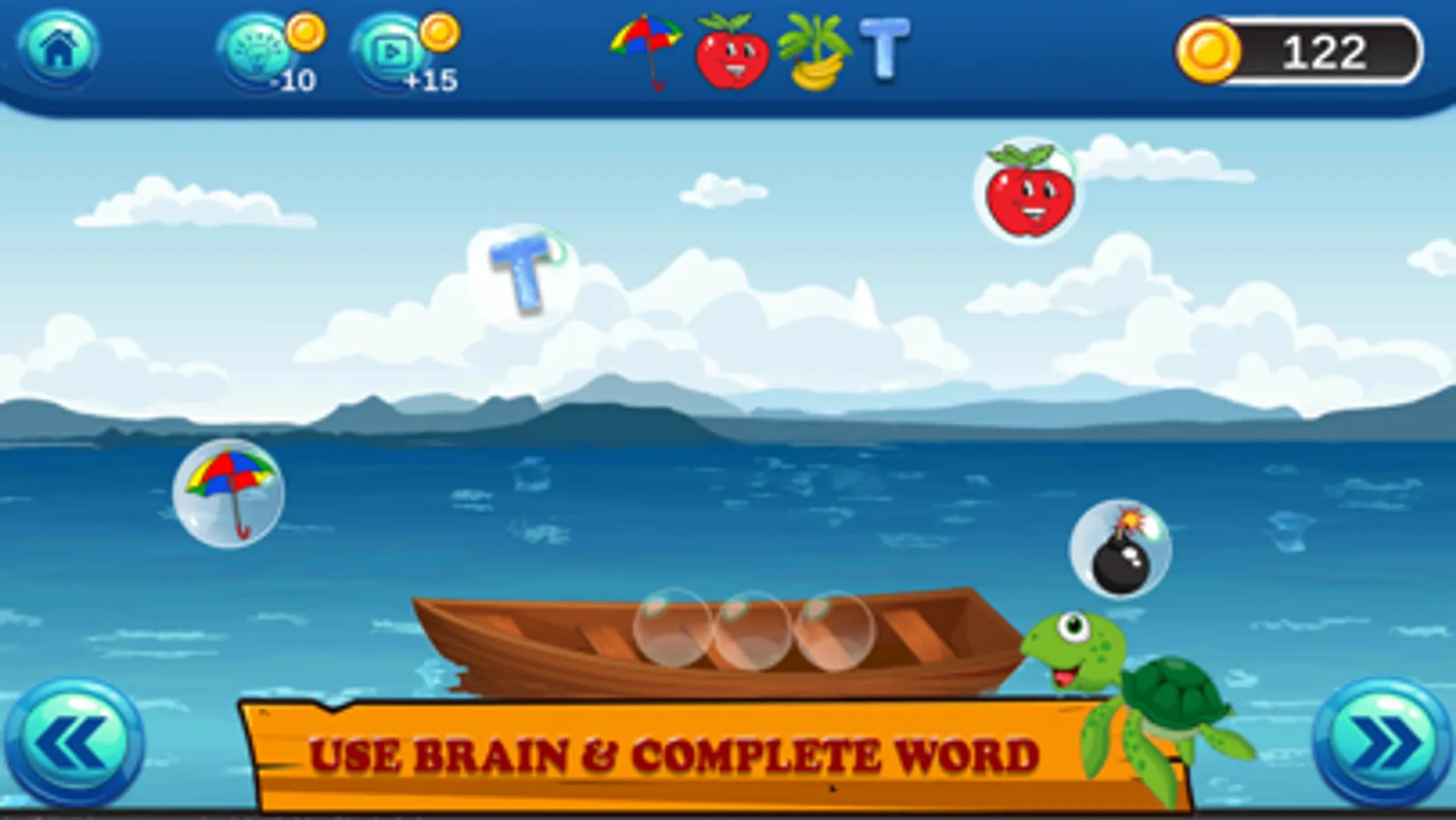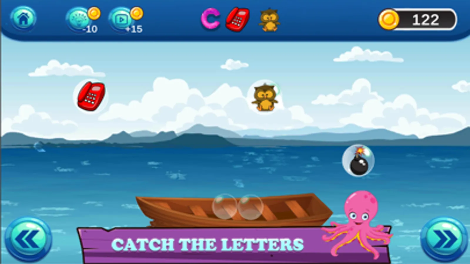 Move the ark, forward and backward with buttons, which contains bubbles and you have to catch Letters or objects like cake in that bubble to complete word.