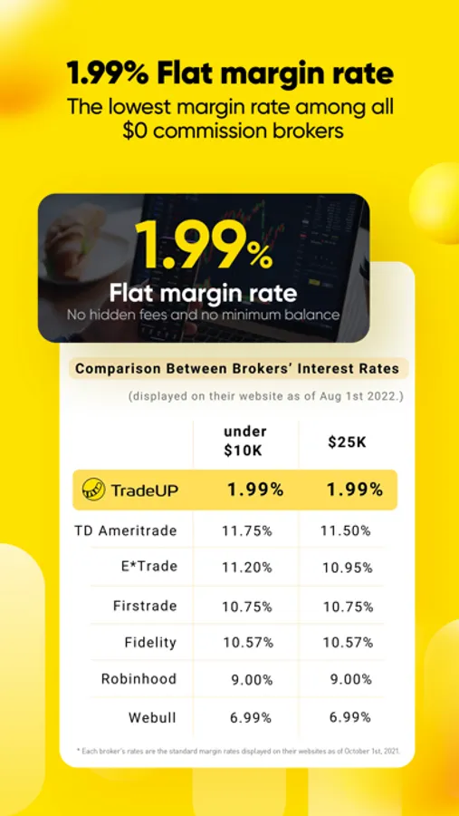 ·Securities products and services offered by TradeUP Securities, Inc. are not insured by the FDIC, and are subject to investment risk, including the possible loss of the principal invested. TradeUP Securities, Inc. charges $0 commission for online US-listed Stocks, ETFs and Options trades. Exclusions may apply and TradeUP Securities, Inc. reserves the right to charge variable commission rates. The standard options contract fee is $0.65 per contract. For more information about pricing, visit https://www.itradeup.com/pricing/commissions