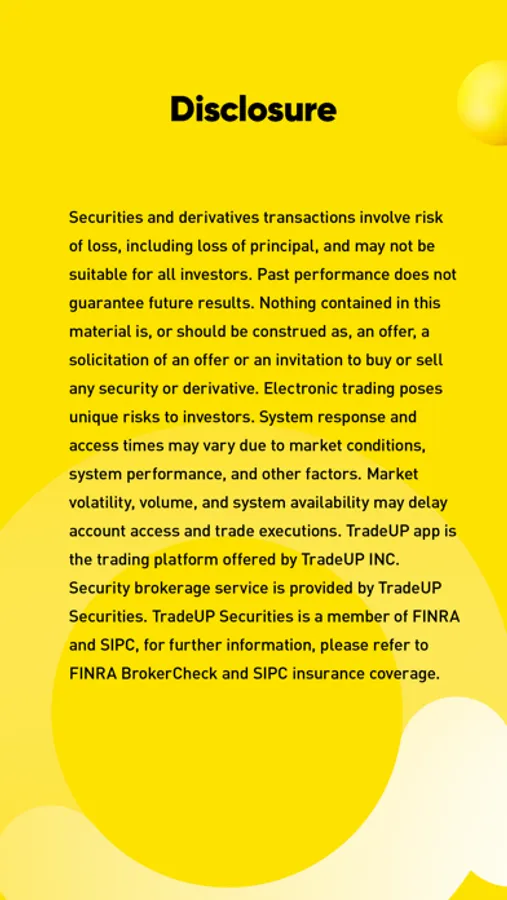 ·TradeUP is not a broker/dealer. Brokerage services in TradeUP are offered by TradeUP Securities, Inc., which is a broker-dealer registered with the SEC and a member of FINRA and SIPC (Securities Investor Protection Corporation). You can check the background of TradeUP Securities, Inc. in FINRA's BrokerCheck (https://brokercheck.finra.org). Your securities account holdings are protected by the SIPC up to $500,000 (with a cash sub limit of $250,000).