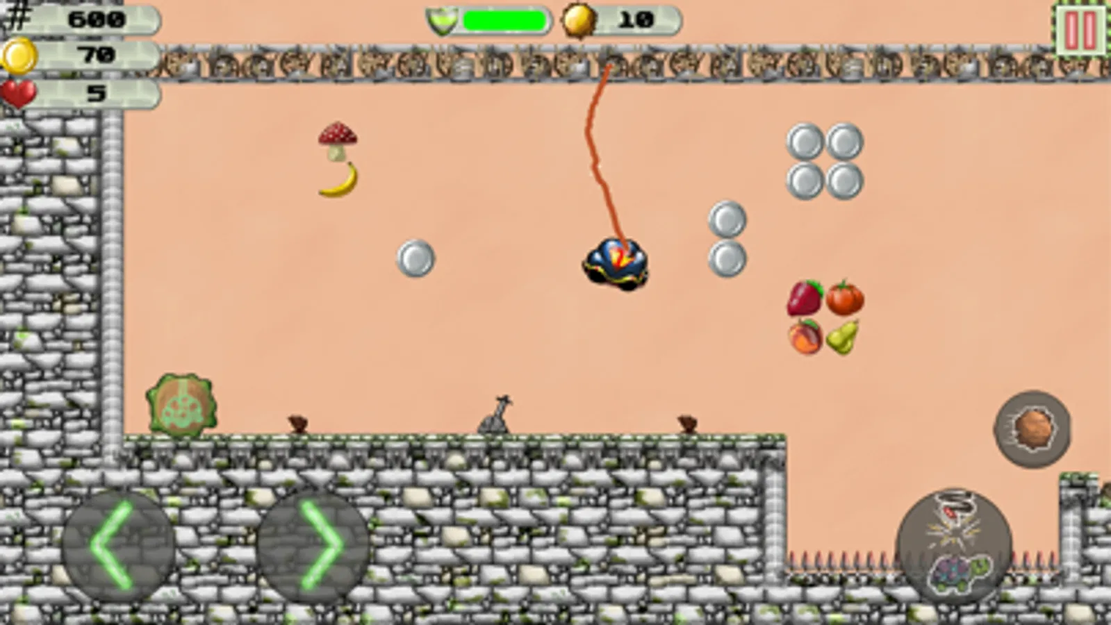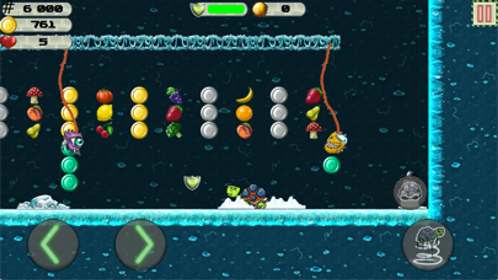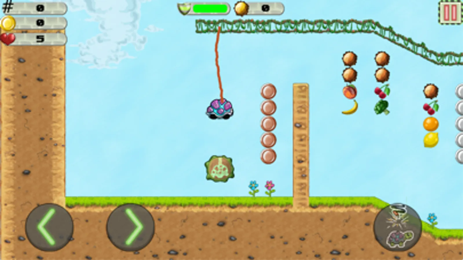 Eat all veggies and fruits to set new high scores. Collect as many coins as you can and unlock all turtles! But be carefull of spikes, falling rocks and enemies that can also fly and bungee!
