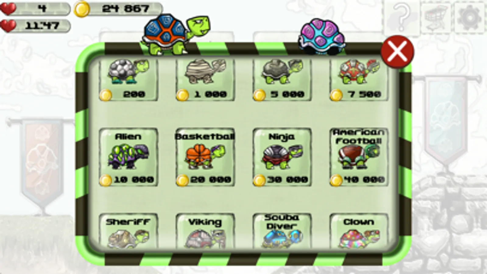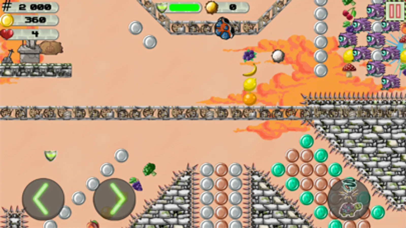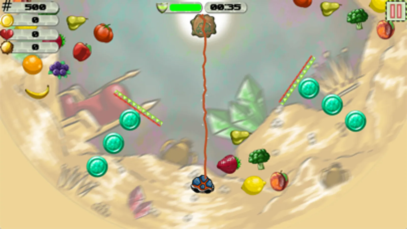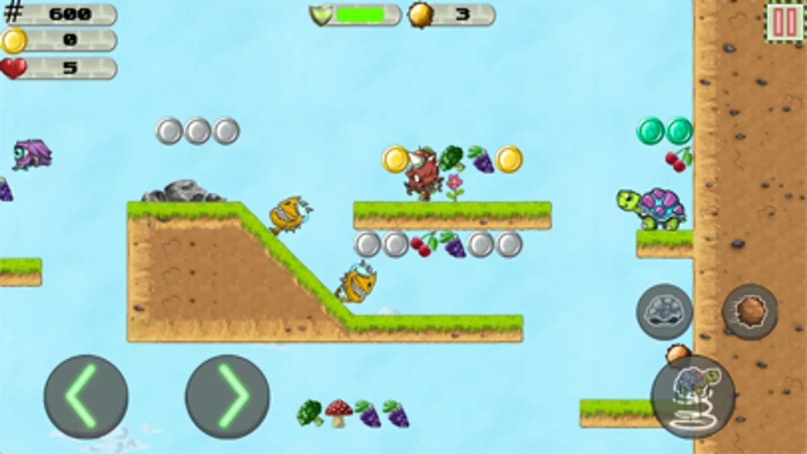 Eat all veggies and fruits to set new high scores. Collect as many coins as you can and unlock all turtles! But be carefull of spikes, falling rocks and enemies that can also fly and bungee!