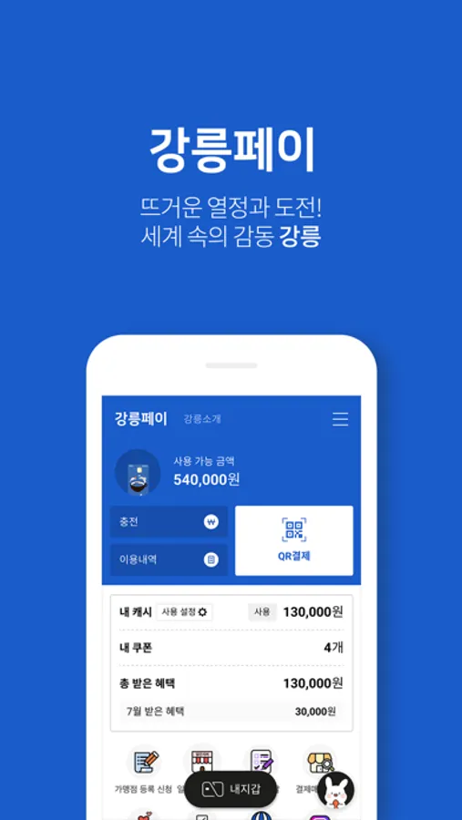 또한 강릉시민에게 복지 수당을 지급하는 수단으로, 지역경제 활성화를 위해 충전 후 결제 시 캐시백을 제공합니다.