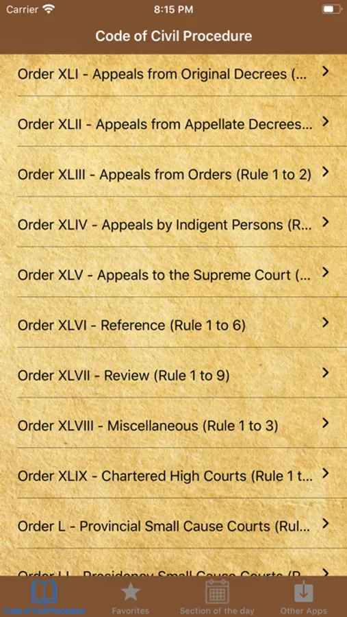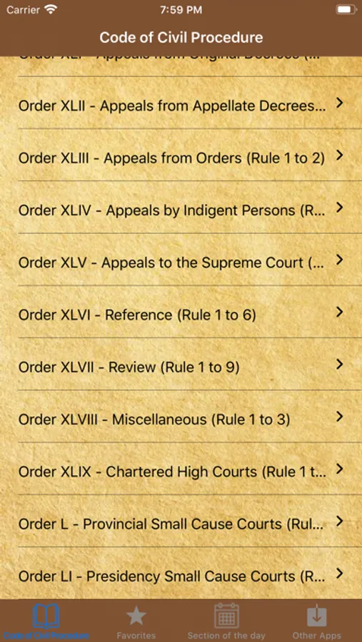 Complete CPC - Code of Civil Procedure presented in a user friendly design with excellent user experience. Divided clearly into Chapters and Sections and unedited text of all Rules/Sections and Orders. Browse through sections with swipe gesture in a clutter free design helping you focus on the core content. THIS APP WORKS IN OFFLINE MODE