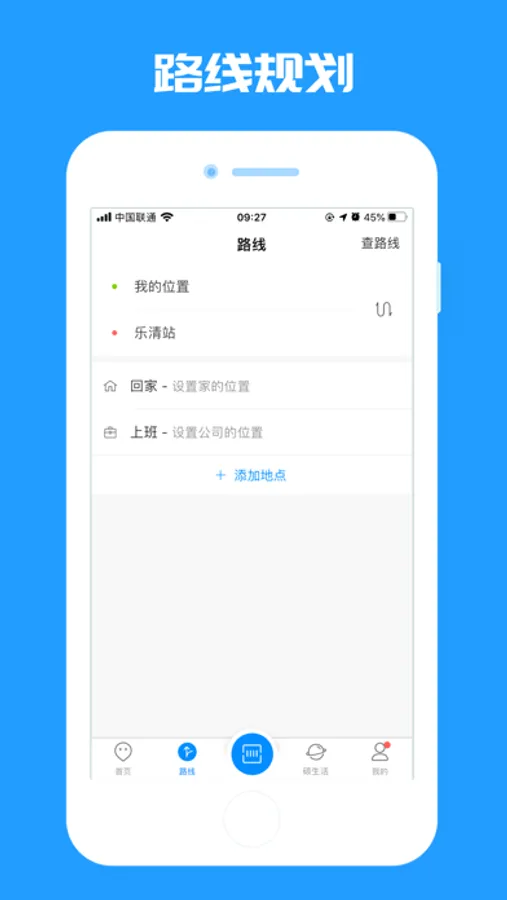⑤路线规划:出门前输入出发地和目的地,智能筛选囊括公交、地铁、步行等出行方式的优选换乘方案。