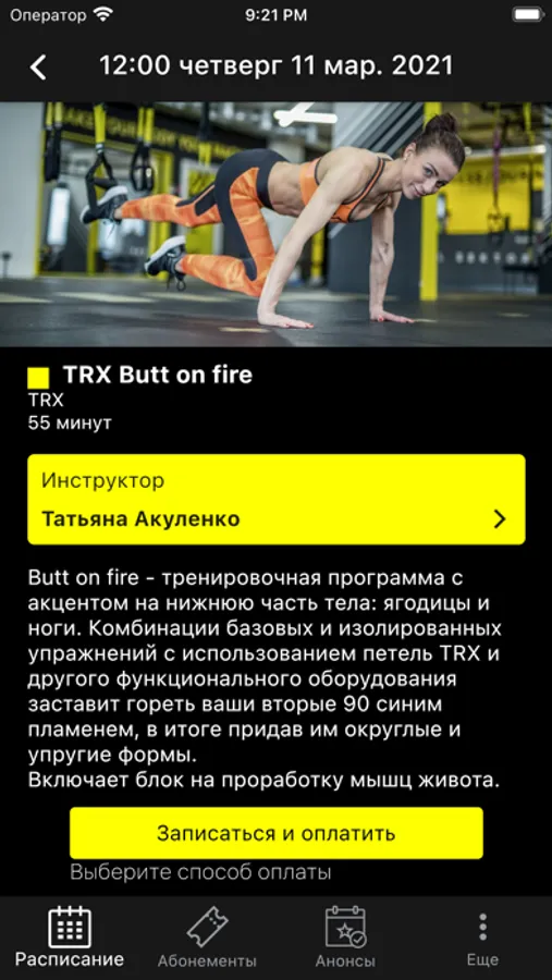 Регистрация в клубе, просмотр расписания и абонементов, запись на тренировки.