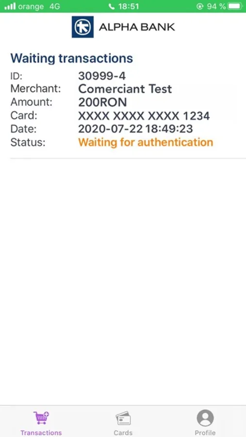 When an ecommerce transaction is made, the cardholder will receive through Alpha Pay Online a Push Notification to inform about the e-commerce transaction that needs to be authorized. The customer will tap on push notification which will redirect to the screen with transaction details where the cardholder have the option to cancel the transaction with a click on “ CANCEL” button or will authenticate the transaction with a click on “ CONFIRM” button. Even though the client doesn`t have the Push notification active /will not click on Push Notification and will go directly to the Alpha Pay Online icon he will be directed to the screen with transaction details where he can authenticate the transaction with a click on “ CONFIRM” button or cancel the transaction with a click on “ CANCEL” button.