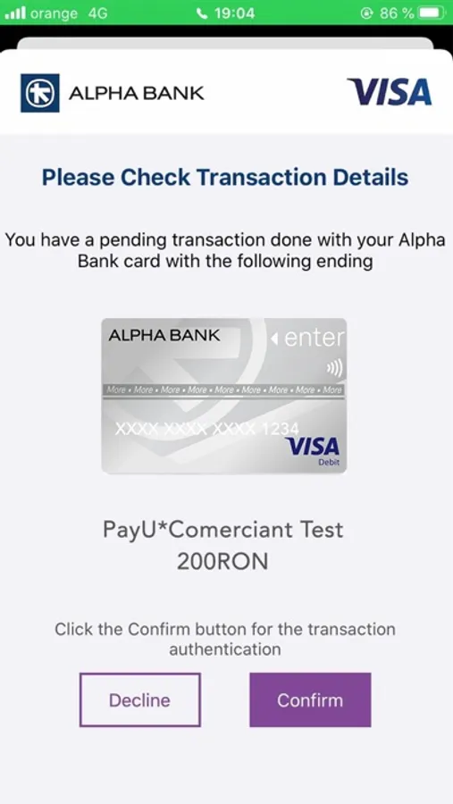 Through Alpha Pay Online application the Alpha Bank Romania cardholders will be able to authenticate the e-commerce purchases using biometric capabilities or other security key available at device level. For security reasons, in order to validate his identity through Alpha Pay Online application the cardholders can register using the last 6 digits of the card number and the mobile phone updated in relation with the Bank. In order to have a successful Registration, a SMS will be sent to the cardholder’s phone number to validate the registration process.