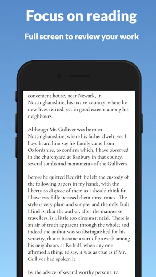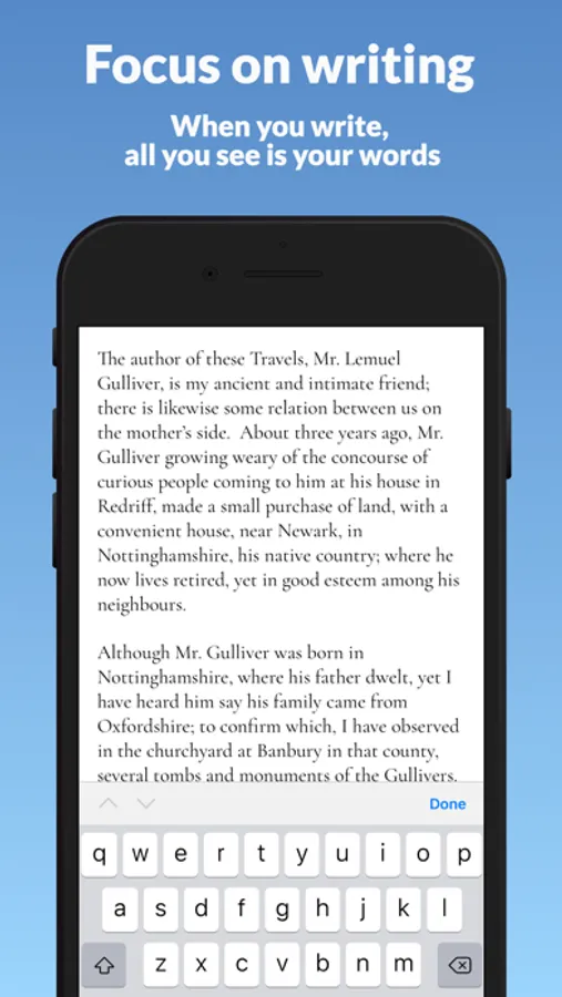While using the app, the user interface fades out, so you are free to concentrate on your words. You have formatting options, but they will not distract you from your work.