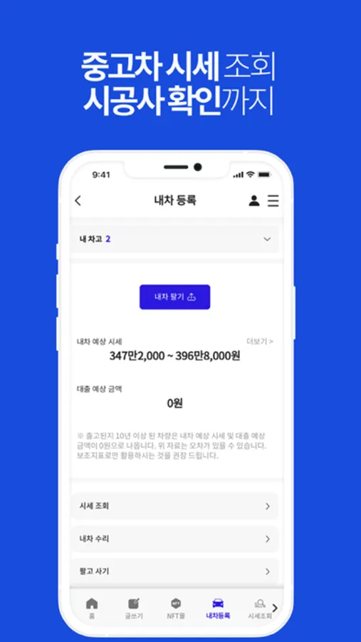 내 차 등록해서 예상 시세 조회와 다른 사람이 내놓은 중고차 매물 시세를