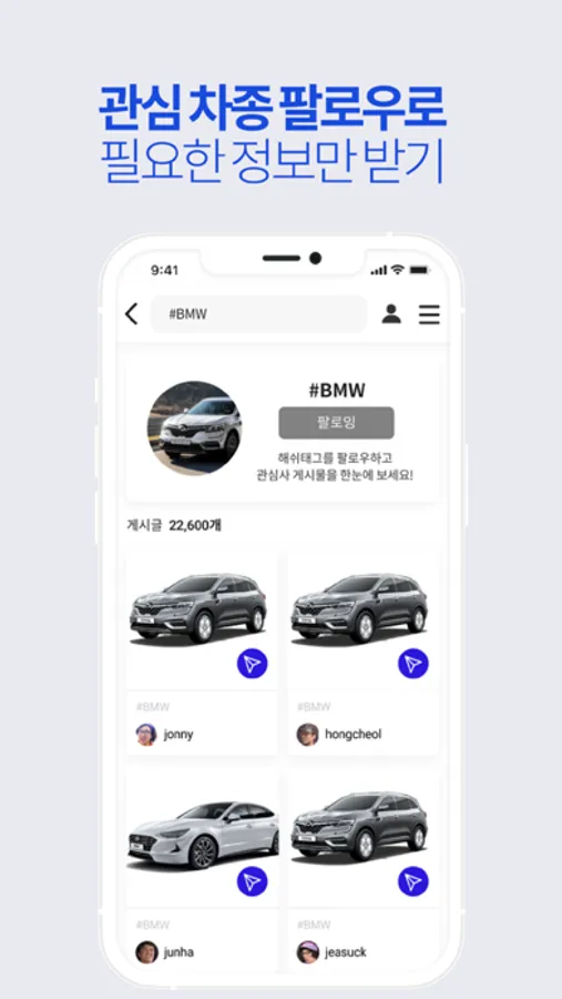 다른 자동차 앱에는 없는 해시태그 기능으로 관심 #키워드를 팔로우하여