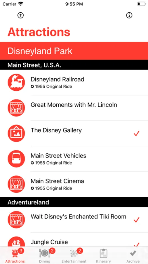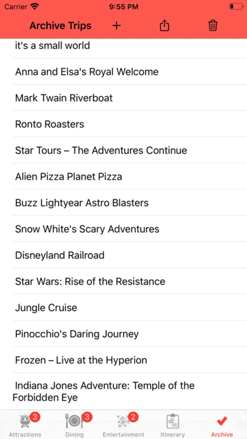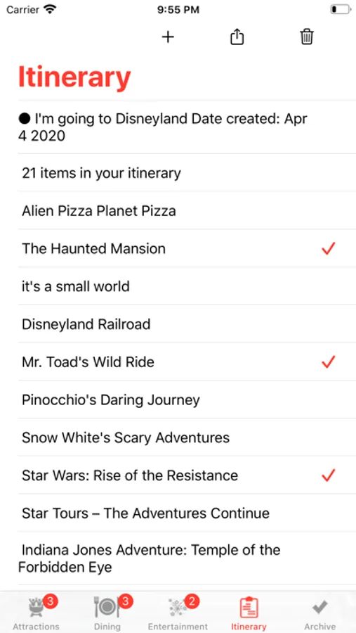 Theme Park Checklist is a TravelGuide checklist app for preplanning, checking off, or highlighting experiences during your trip. You can create an itinerary list and archive your trips too. Plus you can share your itineraries or archived checklist with friends and family.