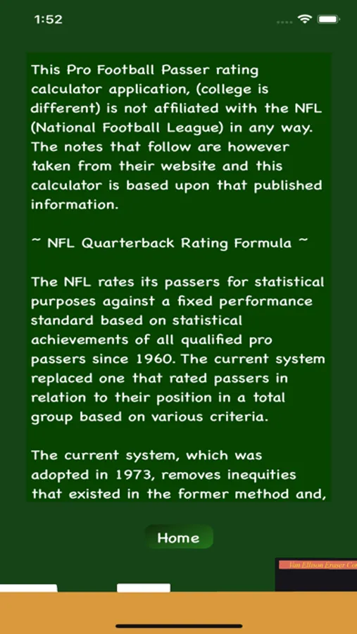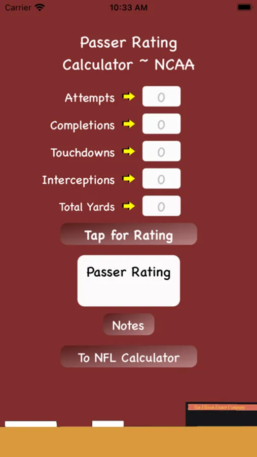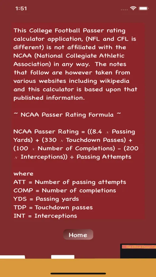 Enter pass attempts, pass completions, touchdowns, interceptions and total yards for result Passer Rating. This application is for either American Professional Football (NFL CFL) or American College Football (NCAA).