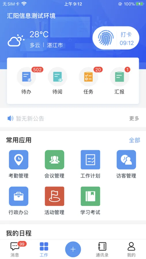 汇办公是移动办公门户,可实时接收各类信息推送,如流程任务、个人日程、会议通知、邮件通知等,并可配置门户常用功能,随时随地开展工作。负责单位组织机构信息管理与用户身份的认证,支持AccessToken认证方式,整合所有子应用的登录入口,提供统一的、便捷的应用服务。