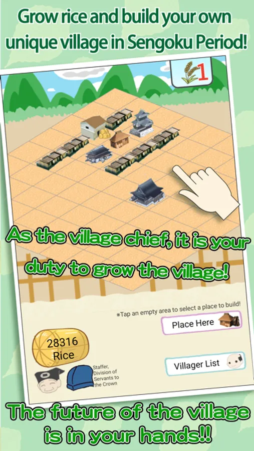As the leader of a village that bears your name, you will build and progress your village during the Warring-States Period. Grow rice in your rice fields and harvest them to collect Rice Points. The Rice Points can be used to build Castles, Housing and Rice Warehouses. It is your duty to gain more villagers and friends, and to expand the village.