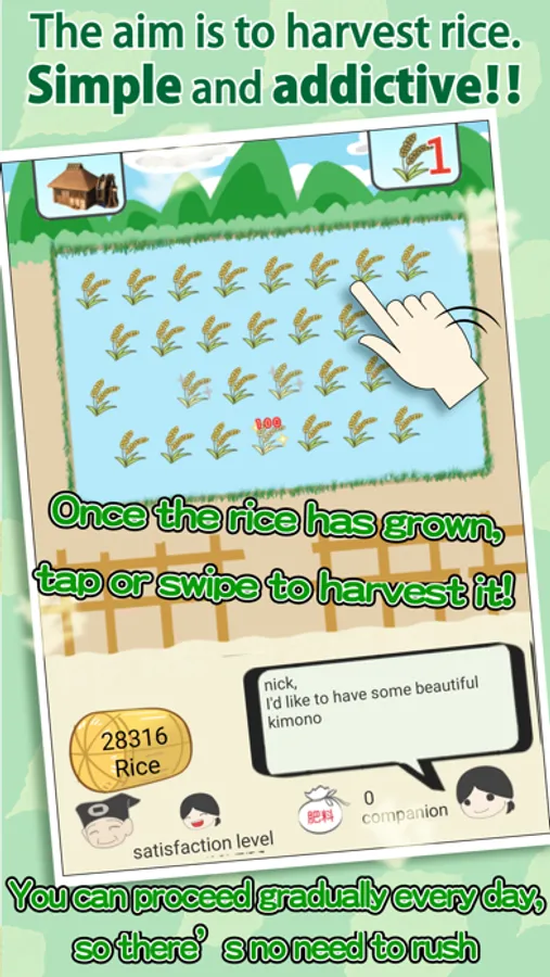 The rice will grow automatically. Fully grown rice can be collected by tapping or swiping. Harvested rice is turned into Rice Points and stored.
