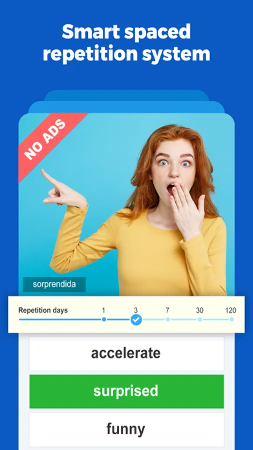 Learn English from basic to advanced vocabulary. As you learn new words, you may start to forget the old ones. Say goodbye to flipping through dictionaries. You don’t need to constantly repeat what you’ve already learned. Review your vocabulary at intervals of 1, 3, 7, 30, and 120 days — and never forget a word ever again.