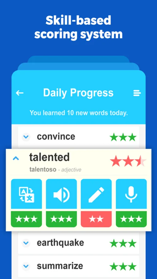 Expand your vocabulary gradually. Pick 5, 10, or 15 words daily, depending on your level and goals. Our spaced repetition system promotes lasting memory, so you won’t forget what you’ve learned.
