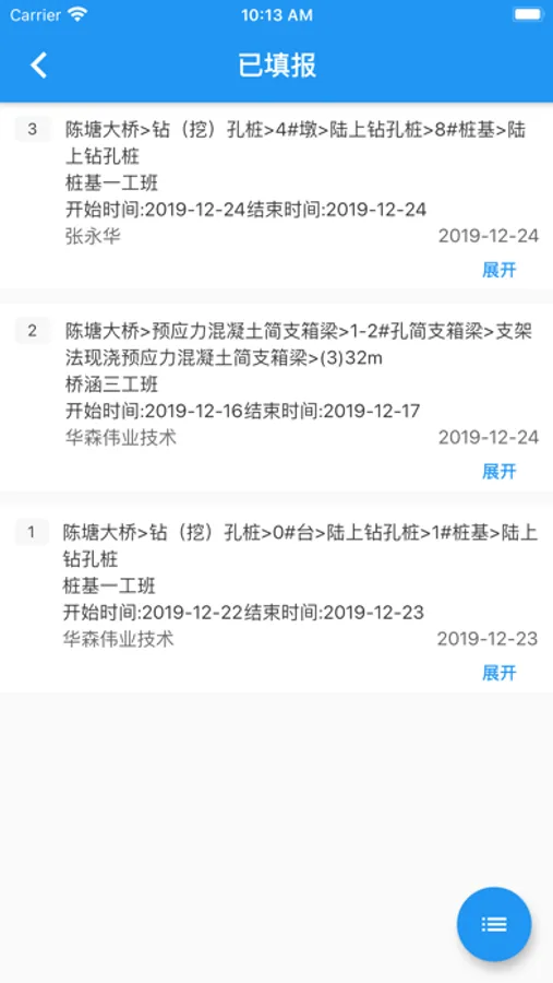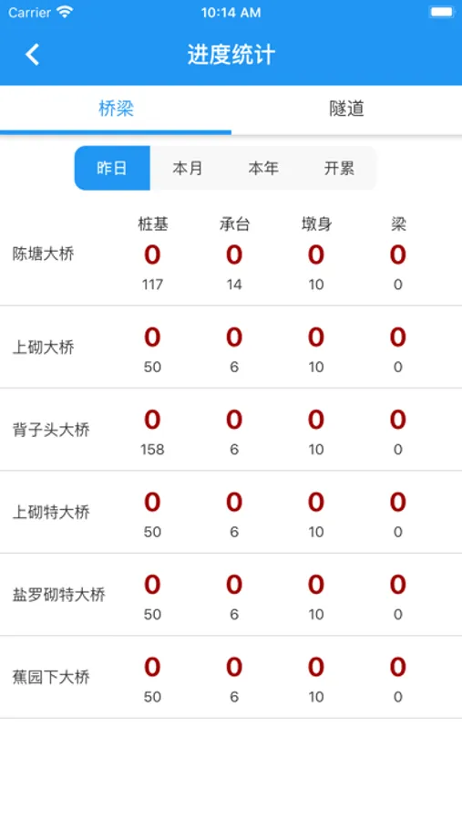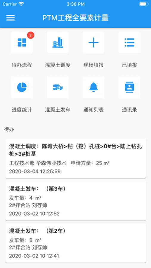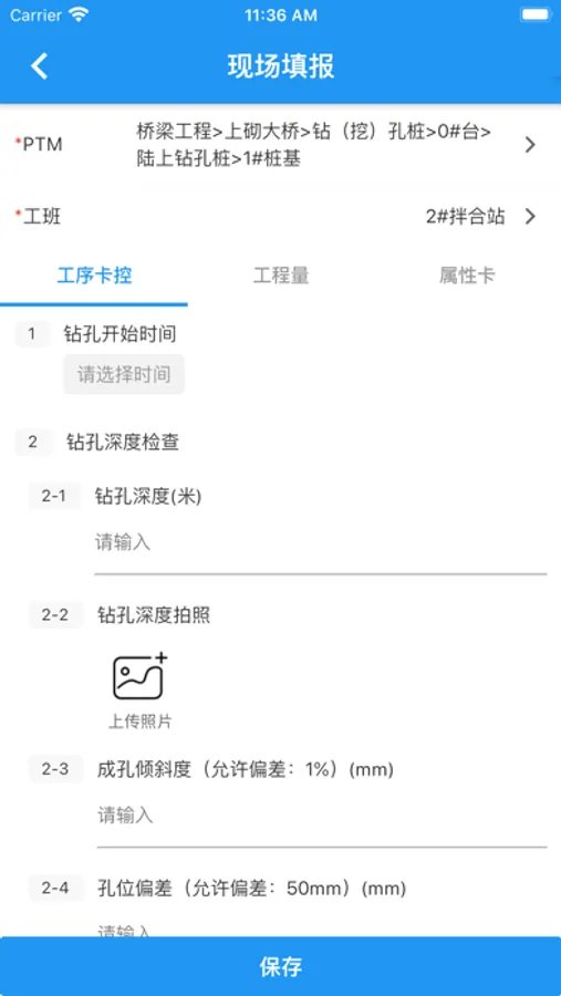 项目开始施工后,按照现场施工进度,在APP端进行现场数据采集,以工班为采集对象,选择施工分部分项,获取所施工工程的PTM基础工程量和属性卡,按照后台分部分项的完结设定,形成每日进度统计,在APP中可直接查看。