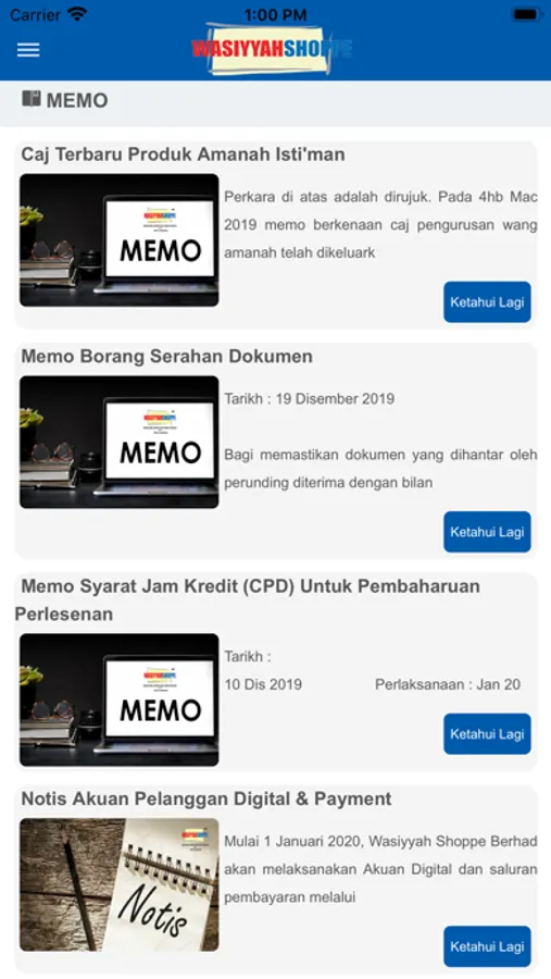 Fungsi utama apps ini untuk menyampaikan maklumat terkini kepada perunding berdaftar Wasiyyah Shoppe Berhad seperti Memo, Notis Dan promosi.