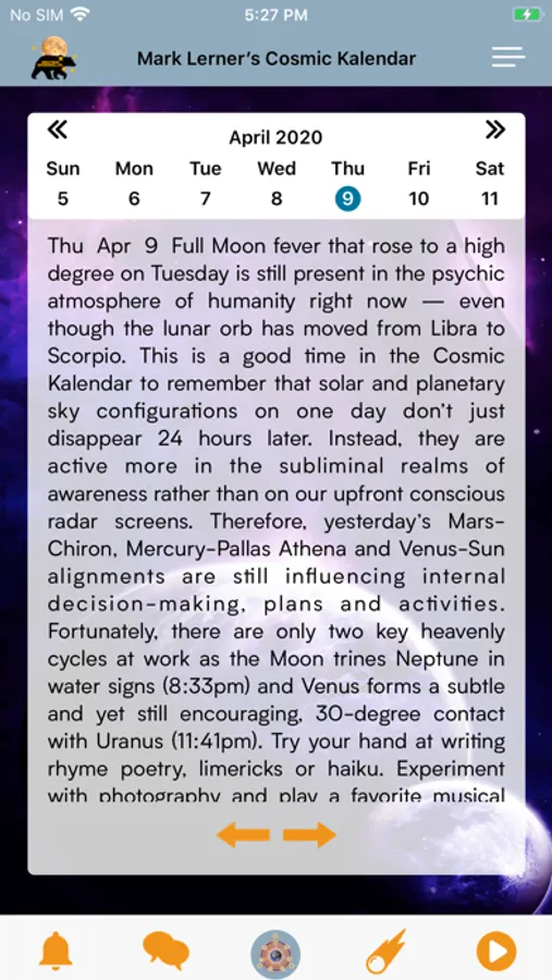 Now as an online resource since 1995, each paid subscriber has full access to the entire Daily Calendar Section which has several features -- the main one being the Extended Daily Cosmic Kalendar always running 2 to 4 weeks into the future, and updated around every week or so. As written by Mark Lerner, the Cosmic Kalendar is only available here inside this app, and thousands of subscribers have found it indispensable in understanding the all-important sky patterns that are a major influence in all of our lives.