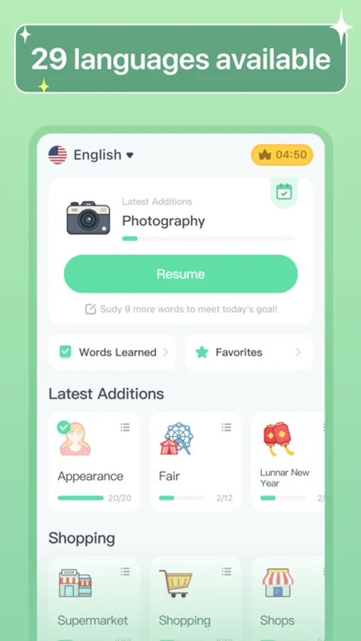 Why do people get hooked on playing games? Not only because they're fun but also because you can get feedback on everything you do, and they help you set goals. Now we have integrated these aspects into HelloWords. You'll feel entertained while learning as well!