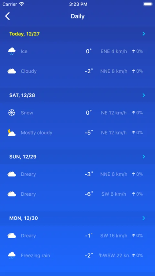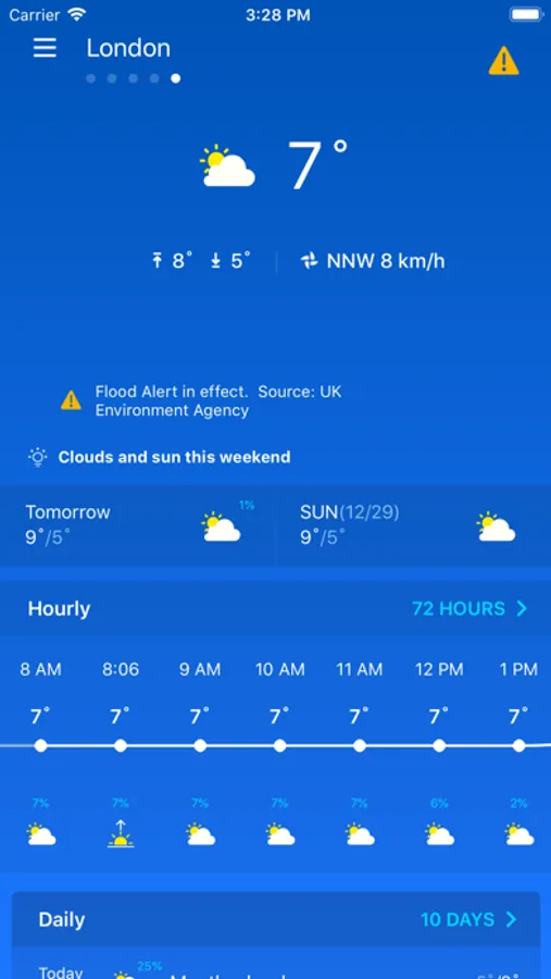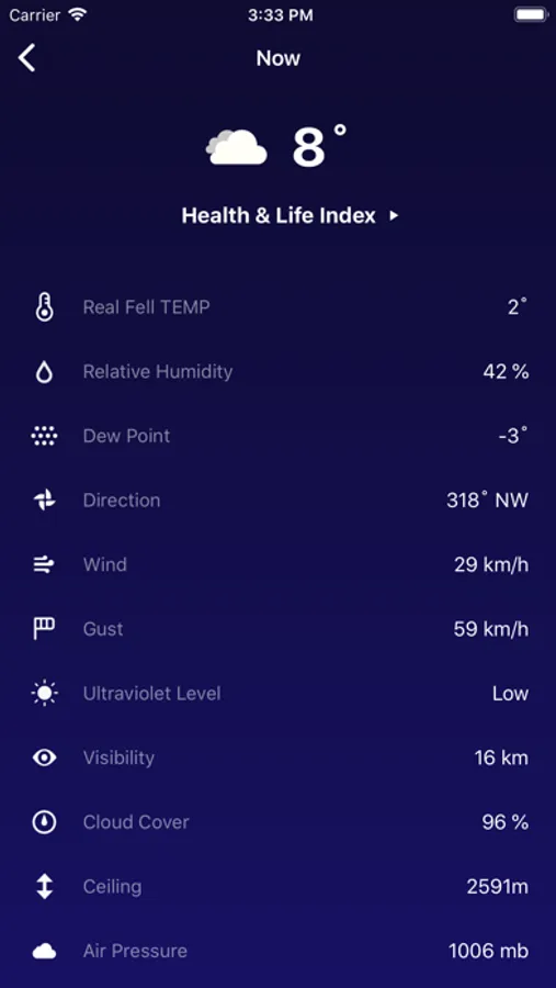 - Change unit setting: Temperature (℃/℉), Time format (12h/24h), Precipitation (mm/cm), wind speed (km/h, mi/h, m/s), pressure (mb, inHG, mmHG, Pa), visibility(miles/km)