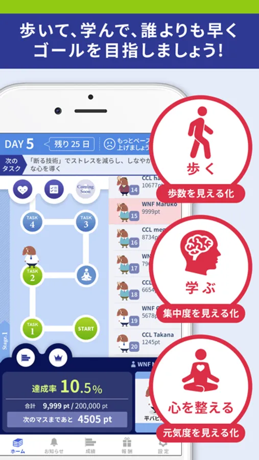 本アプリは、「歩く(カラダを整える)」「マインドフルネス(ココロを整える)」「健康を学ぶ」を実践できるアプリです。歩数に連動した「すごろく方式」で、健康に対する知識(ヘルスリテラシー)をゲーミフィケーションで高めることができます。