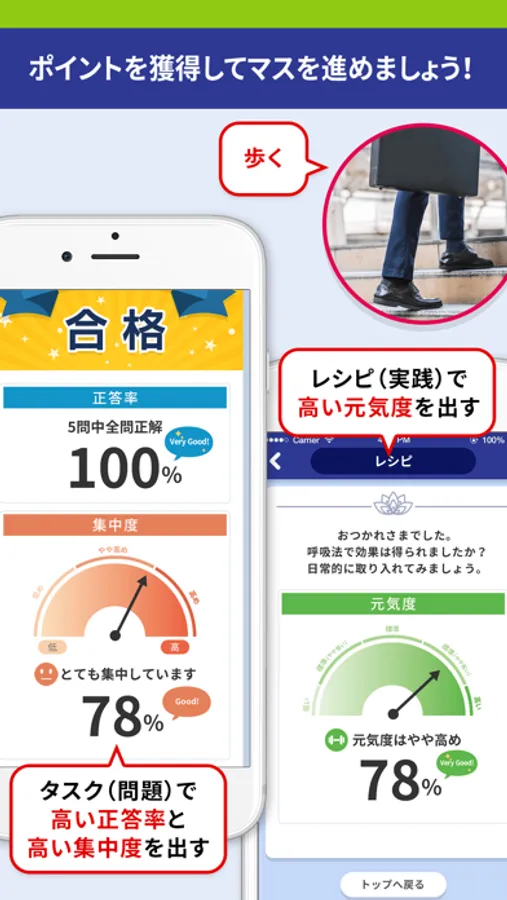 ①最先端の人間情報の学術研究成果に基づき開発。歩く、マインドフルネスを行う、自分のメンタルコンディションを知ることで、ココロとカラダを整えながら、スキマ時間で健康を学ぶことができます。