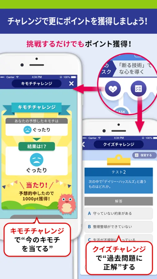 ドリルで学習するカテゴリーは「睡眠」「食事」「運動」「人間関係」「生活習慣」の5つ。各カテゴリーに、それぞれの分野のエキスパートによるオリジナルドリルをラインナップ。また、企業内で、実際に講師のセミナーを受講した場合には、連動するドリルがその復習となり、受講内容の定着を高めます。さらに、一緒にスタートを切った仲間の学習進捗状況や、集中度や元気度などの順位がわかり、学びの一体感が味わえます