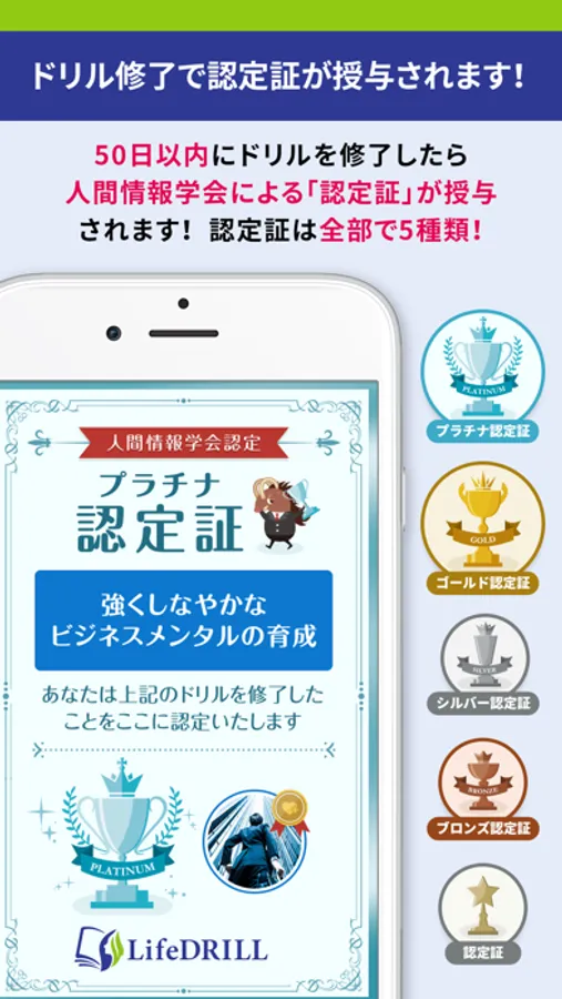 ③ゲーミフィケーションで、様々な学習コンテンツ(ドリル)を、仲間と共に楽しく学習でき、修了すると人間情報学会による認定証や、QUOカードPayによるポイント(法人様向け機能)がもらえます。