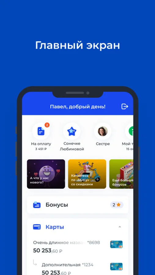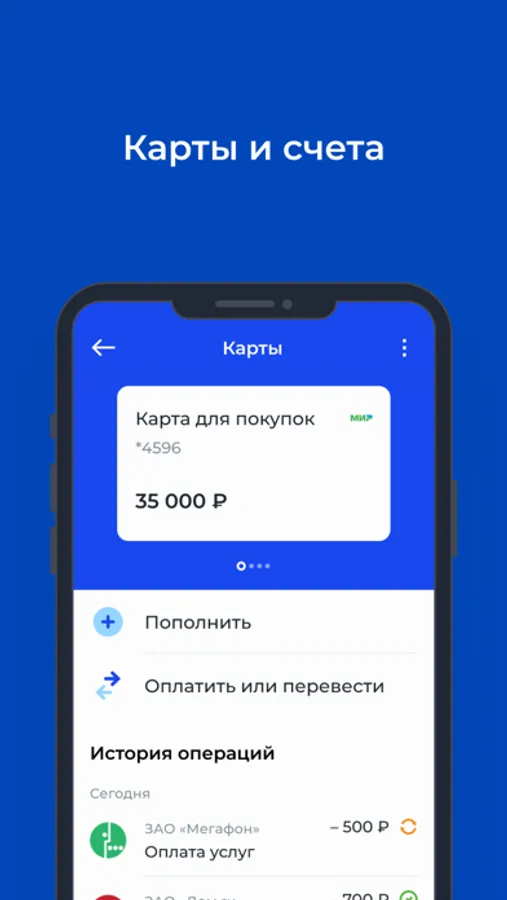 • Контроль средств и остатков по картам, вкладам и кредитам.