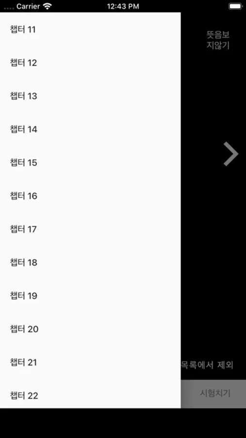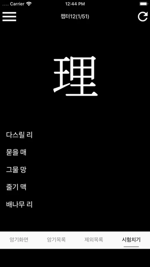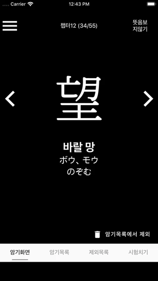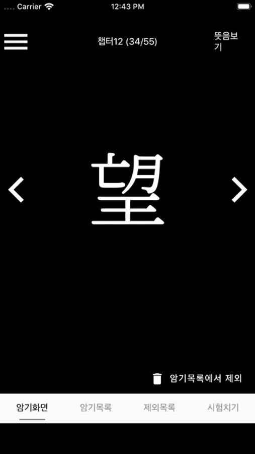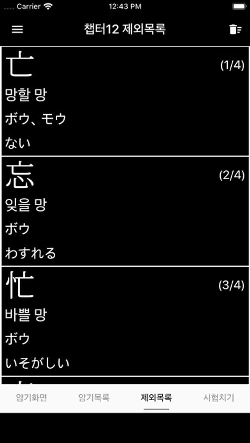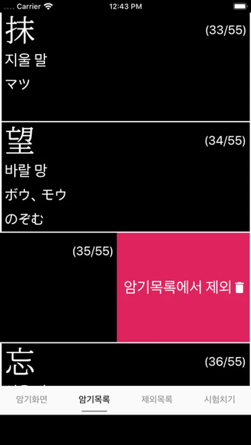 목록에서 아이템을 왼쪽으로 밀면 해당 목록에서 제외되고 암기 화면은 암기목록의 한자들이 표시됩니다.