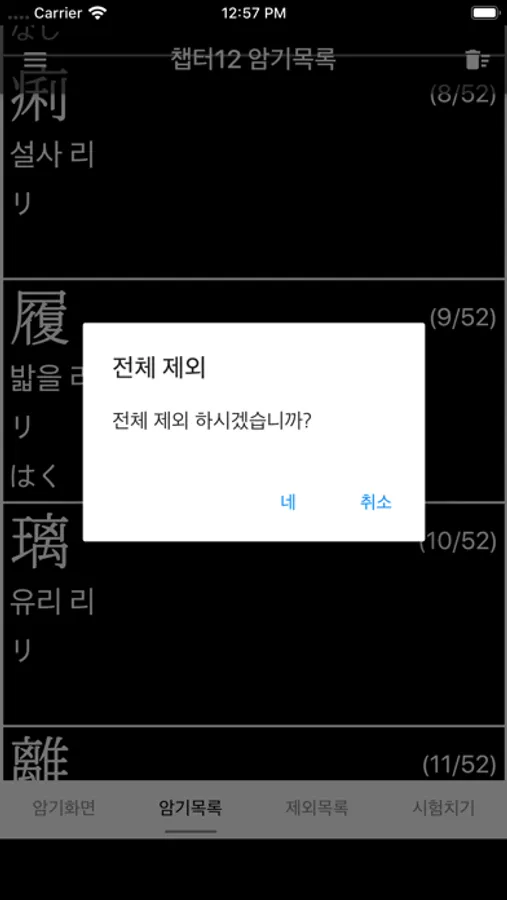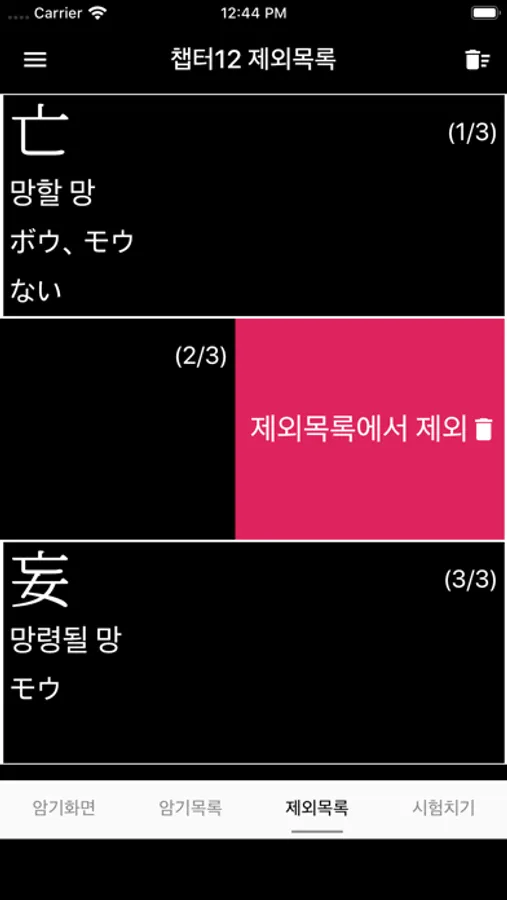 제외된 한자들은 우측 탭의 제외목록에 표시 되며 목록에서 아이템을 왼쪽으로 밀면 해당 한자가 제외목록에서 제외되어 암기목록에 포함됩니다.