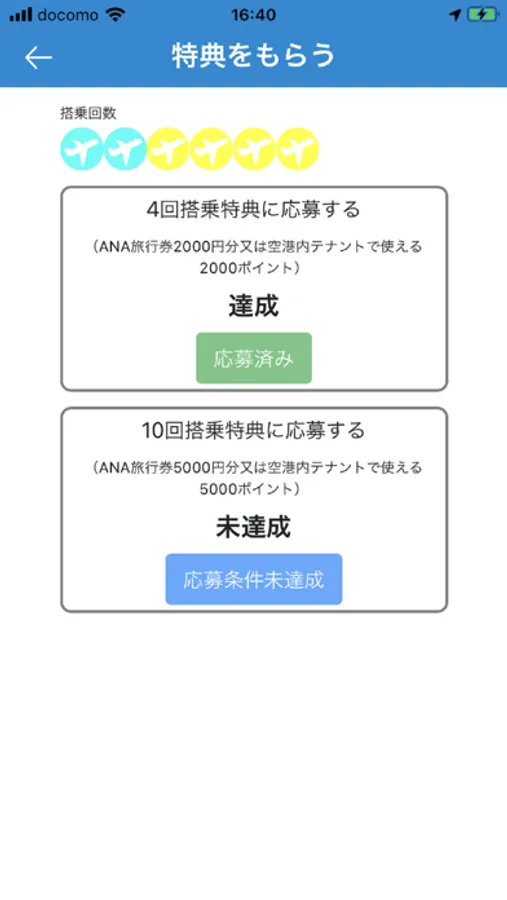 会員が富山きときと空港発着の国内・国際路線を4回搭乗または10回搭乗された場合、ご搭乗回数に応じて「ANA旅行券」または空港内施設で使える「お買い物・お食事券(電子ポイント)」をプレゼントします。