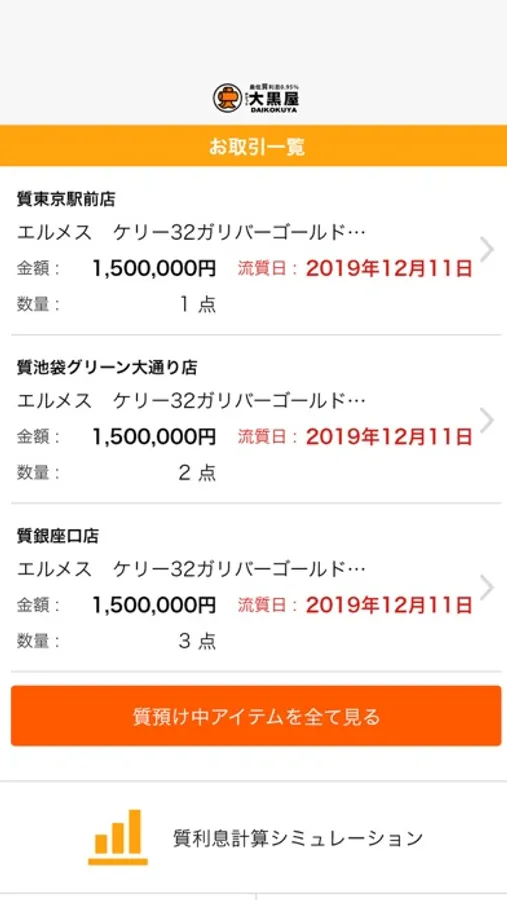 どの店舗にどんな品物をいくらで預けたか、などが確認できます。わざわざ質札を取り出す必要はありません。