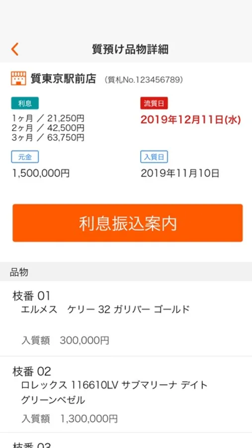 「入質日」「流質日」がカレンダー上で確認できます。預けたお品物の質札番号やアイテムが下のリストで合わせて確認できるようになっています。