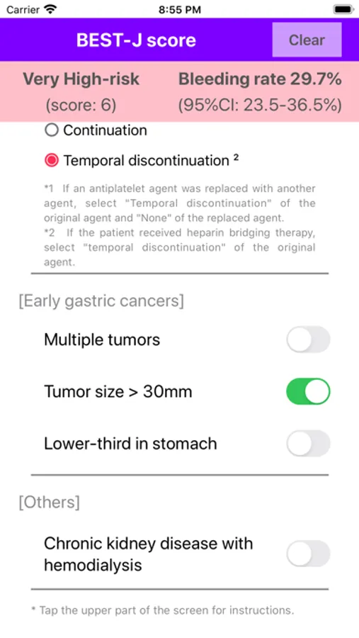 Bleeding after ESD occurs in 4.1%–8.5% of patients who undergo gastric ESD. The "BEST-J score" is a prediction model to stratify the risk of bleeding after ESD for early gastric cancers. Nine factors were weighted with point values: 4 points for anticoagulants (warfarin, direct oral anticoagulants), 3 points for chronic kidney disease with hemodialysis, 2 points each for P2Y12 receptor antagonist (thienopyridine) and aspirin, 1 point each for cilostazol, a tumor size >30 mm, lower-third in tumor location, and presence of multiple tumors, and −1 point for interruption of each kind of antithrombotic agents. The patients were categorized into four bleeding risk groups: low (0–1 points: 2.8% risk), intermediate (2 points: 6.1%), high (3–4 points: 11.4%) and very high (≥5 points: 29.7%).