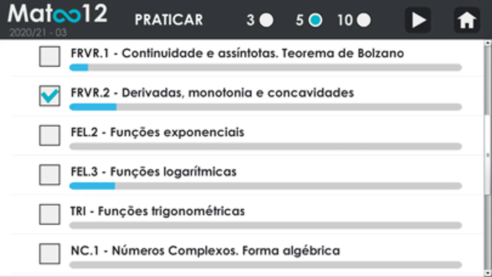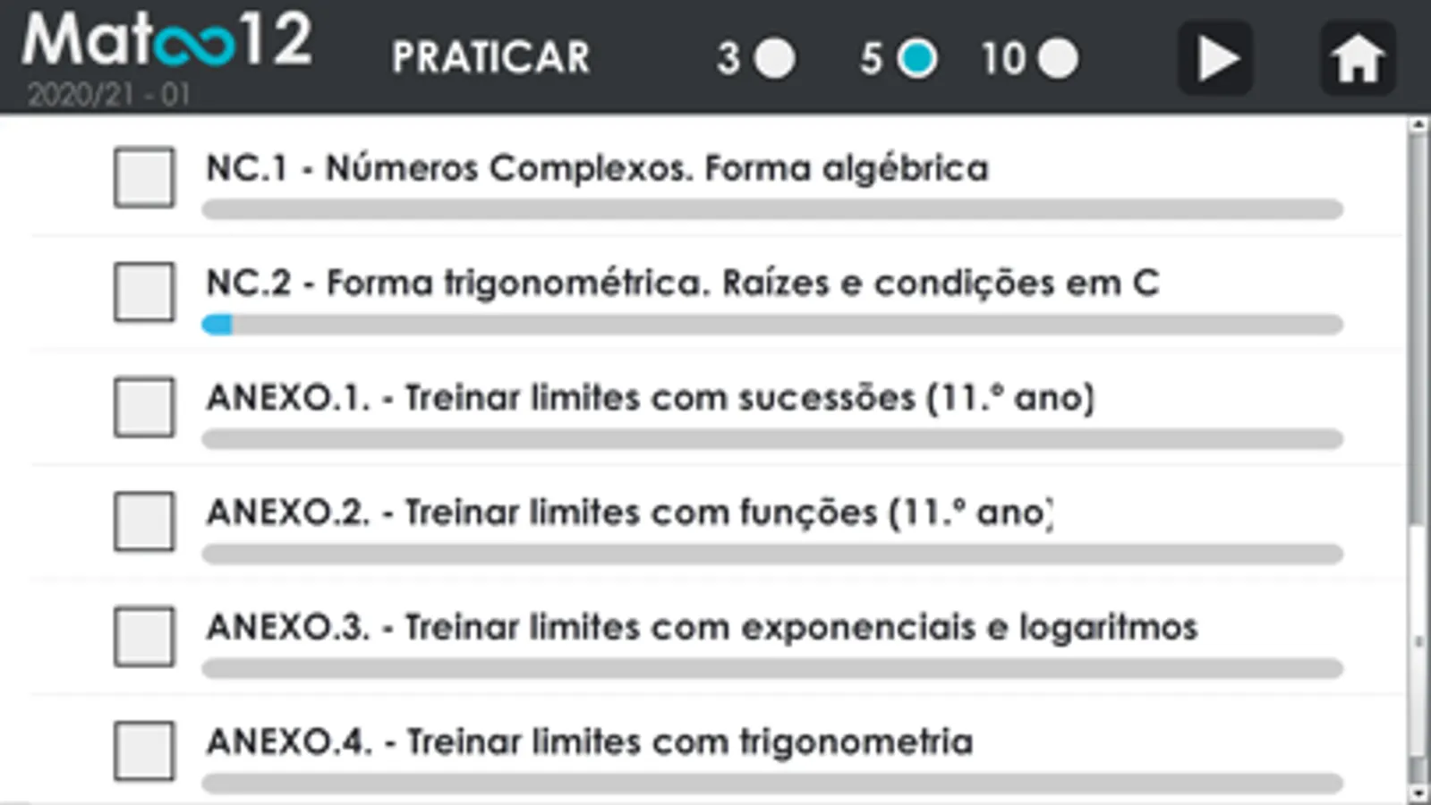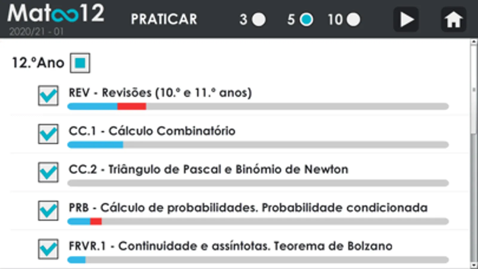 Na secção do PRATICAR, poderás treinar a resolução de mais de 500 exercícios de Matemática (estilo exame), organizados pelos seguintes temas: