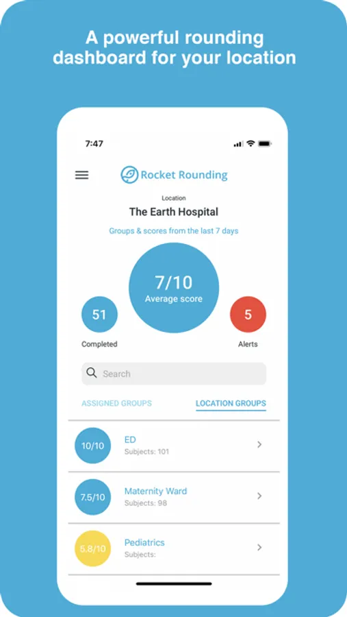Designed to balance functionality with ease of use, Rocket Rounding facilitates person-to-person surveys along with real-time service recovery tools. Start rounding at rocket speed with these features: