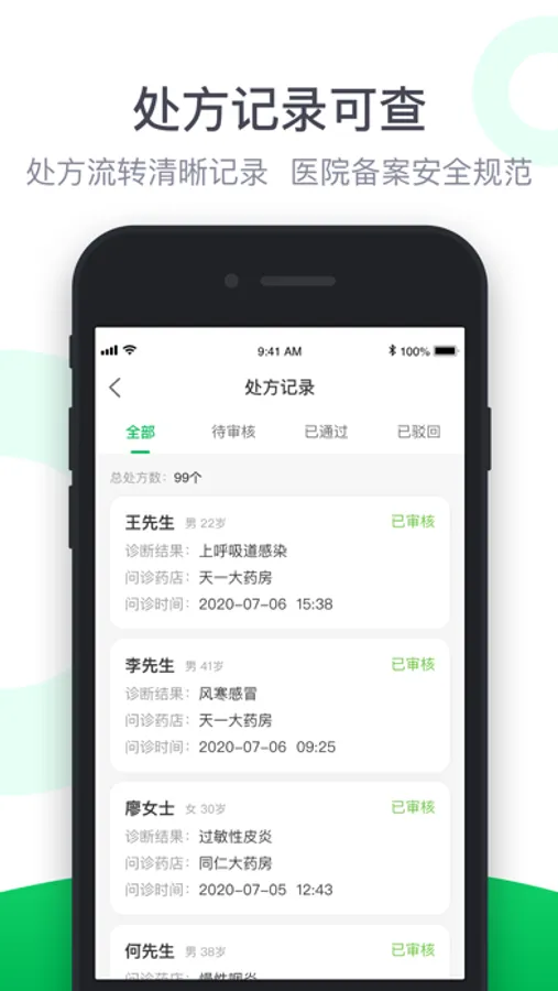 【规范开方】在线开具处方经CA电子签名认证,权威可靠;处方流转清晰记录,医院备案安全规范。