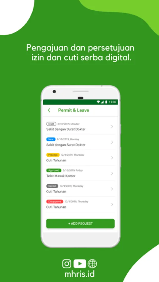 - Pengajuan dan persetujuan izin, cuti, dan sakit