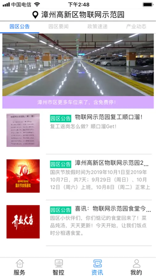 3. 资讯:进行了园区公告、园区要闻、政策速递、产业动态的细化归类,更加方便用户获取及查阅相关资讯。