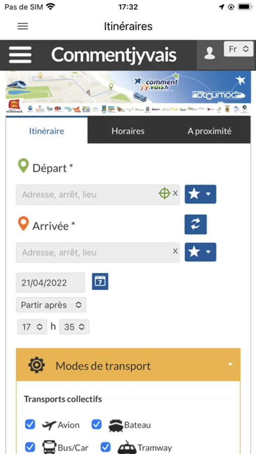 Accueil : Grâce aux fonctions de géolocalisation de votre smartphone, vous pouvez effectuer directement la recherche d’itinéraires à partir de votre position et consulter facilement les horaires de passage des bus aux arrêts les plus proches.