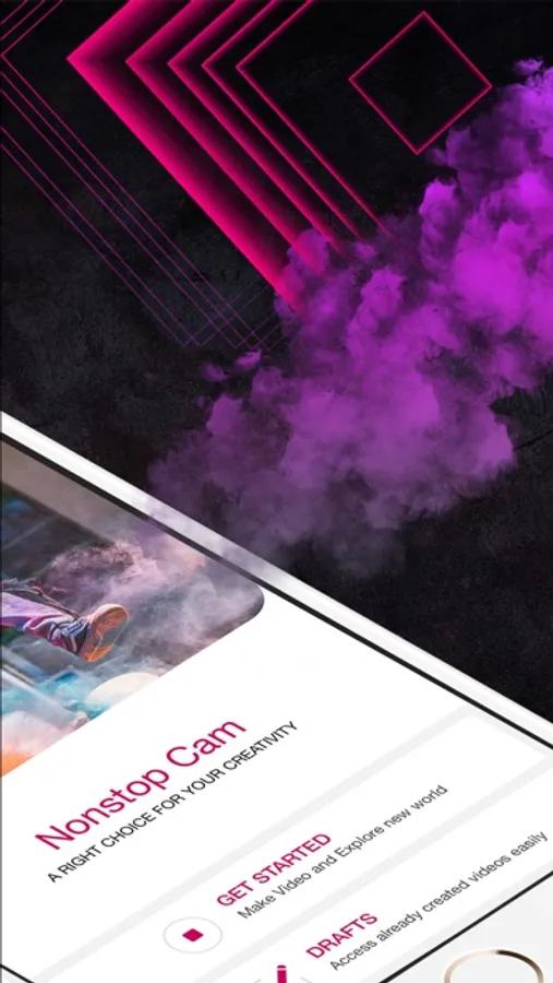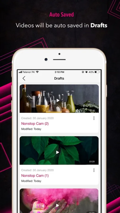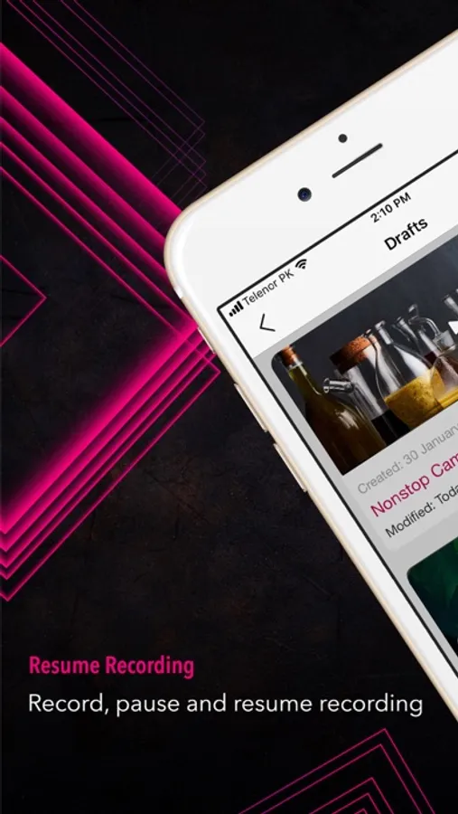 This app is super easy and free to use and makes it easy to pause and continue recording into a single video clip. You do not have to record videos in chunks and splice them together later. Videos will be auto-saved in drafts. No editing, no waiting, just fast and fun!